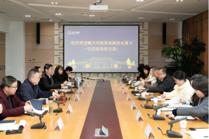 (来源:教务处 通讯员:熊洁 编辑:姚瑶)为科学谋划“十五五”事业发展蓝图,学习借鉴同类高校先进办学经验,12月5日,武汉晴川学院常务副校长夏力率队,校长助理张涛及教务处、人事处、教学质量监控与评估中心、科研处与实验室管理中心等职能部门负责人一行11人,赴武汉学院开展专题调研。武汉学院校长李忠云、校党委书记陈祖亮、副校长罗航、校长助理强静仁及相关部门负责人接待了调研团队。