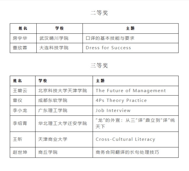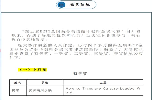 (来源:外国语学院 通讯员:刘泽政 编辑:姚瑶)近日,第五届BETT全国商务英语翻译教师金课大赛评选结果揭晓,武汉晴川学院外国语学院教师表现优异。其中,商务英语系副教授柯可老师的参赛作品《How to Translate Culture-Loaded Words(如何翻译文化负载词)》荣获本科组特等奖,大学英语课部房宇华老师的参赛作品《口译的基本技能与要求》获本科组二等奖。