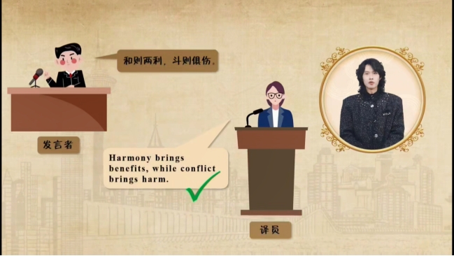 房宇华老师的课程则聚焦口译入门,帮助学生掌握基本口译知识与技能。课程以资深口译员张京的口译现场实录为导入,引导学生思考专业口译员的核心素养,并结合功能对等理论,系统讲解语义、形式、语气、语境及言外之意等多层次对等要求。
