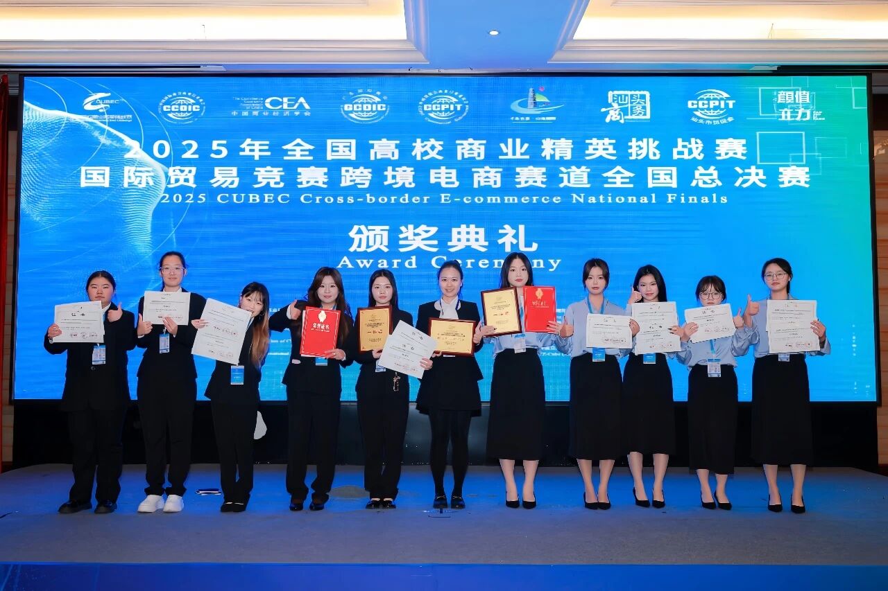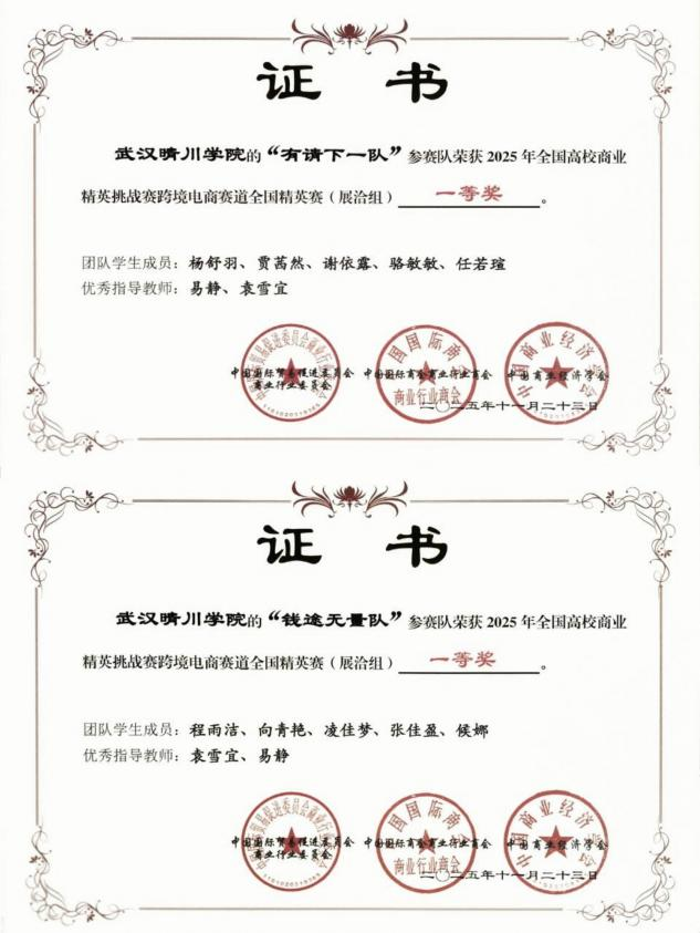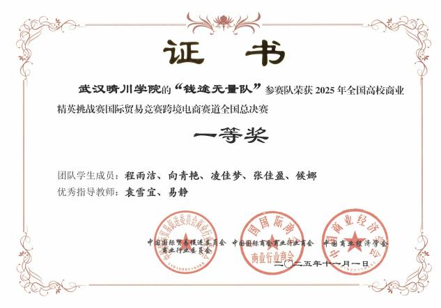 近日,2025年全国高校商业精英挑战赛国际贸易竞赛跨境电商赛道全国精英赛圆满落幕。本届赛事共吸引来自全国近500所高校、5000余支队伍报名参赛,经过知识赛、校赛、省赛和国赛的层层选拔,最终60余支顶尖团队齐聚全国总决赛。武汉晴川学院外国语学院的“有请下一队”和“钱途无量队”在指导老师易静、袁雪宜、李晶的悉心指导下,在全国众多高校队伍的激烈角逐中脱颖而出,双双斩获2025年全国商业精英挑战赛国际贸易竞赛跨境电商赛道全国总决赛一等奖、全国精英赛精英奖,全国精英赛(展洽组)一等奖,武汉晴川学院获“最佳院校组织奖”荣誉称号。